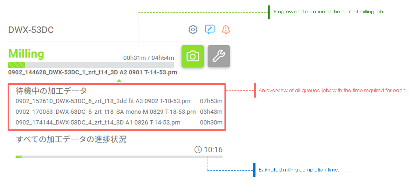 We can check the progress and duration of the current milling job, as well as the estimated time required for pending jobs, through DGSHAPE Insight. We use this information to prepare the additional job data.