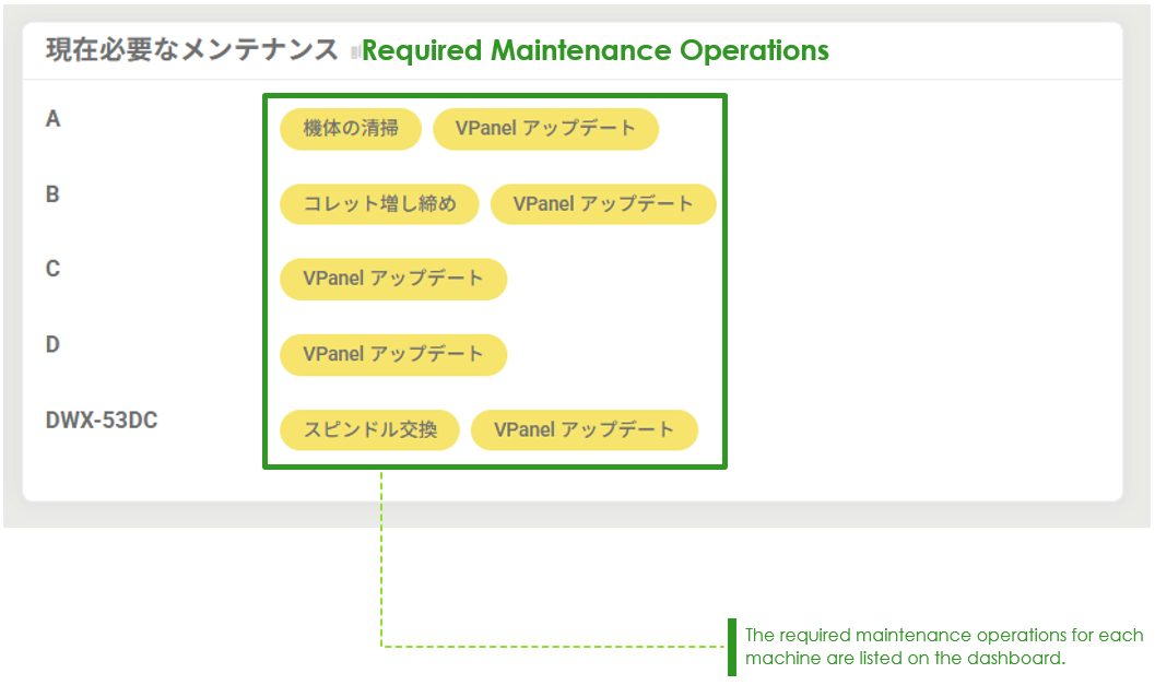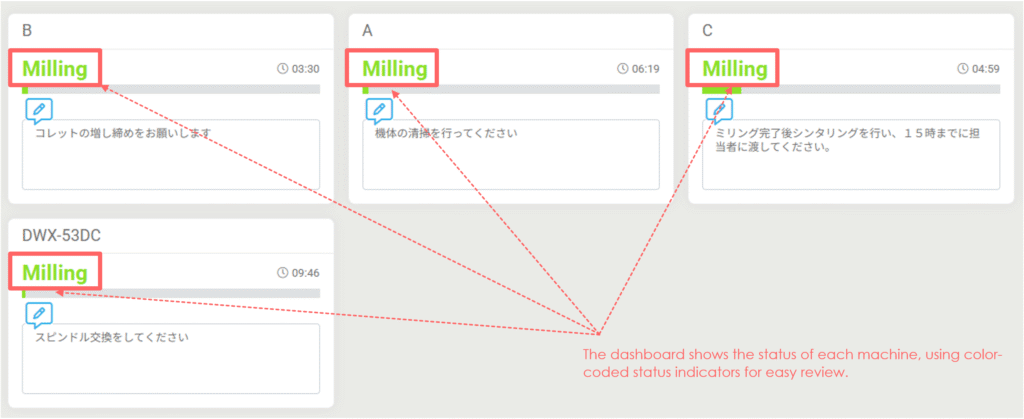 We often check the dashboard which shows the maintenance requirements for each machine in one place, and helps us schedule and conduct the needed maintenance procedures. Also, the status for each machine is color-coded, which helps us instantly see whether milling has been completed and check the current condition of each machine at a glance.